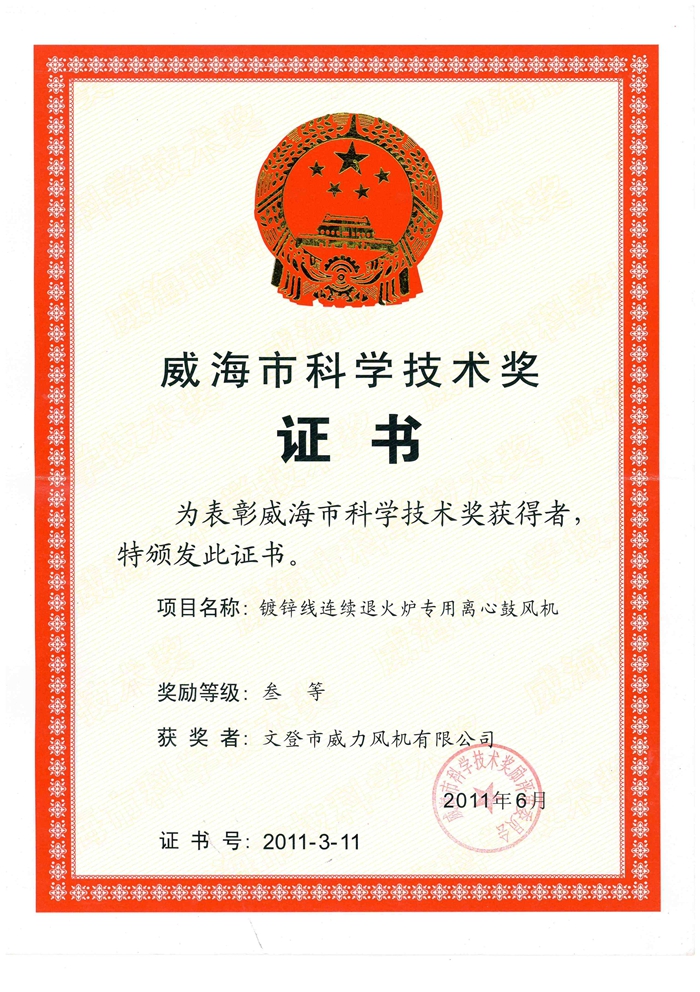 威海市科学技术奖 叁等奖